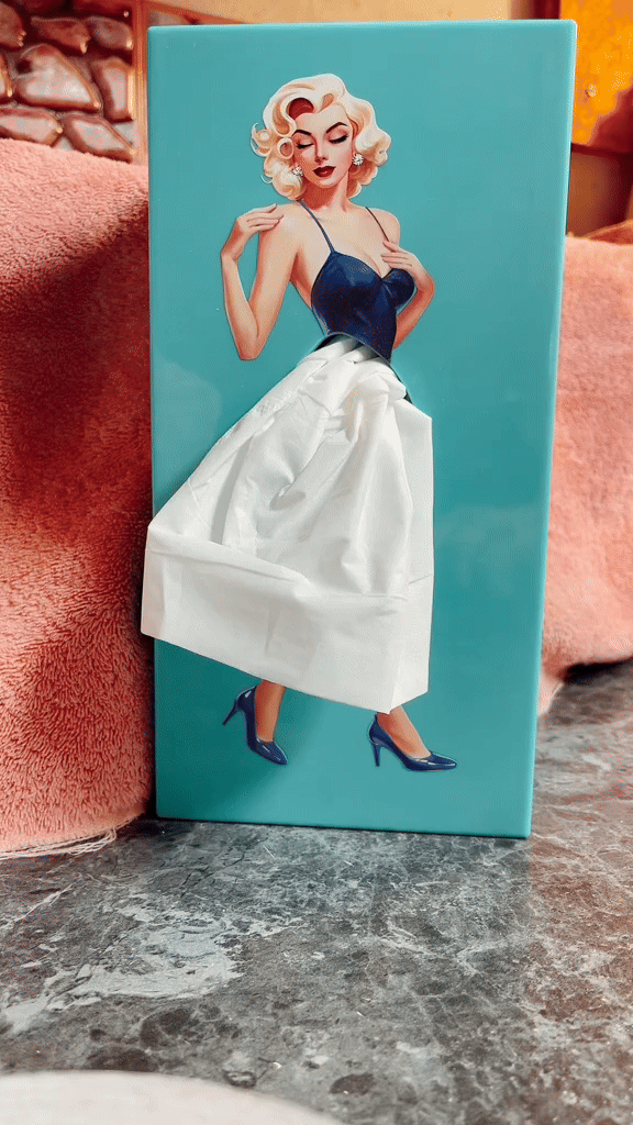 Η μοναδική σχεδίαση αυτής της θήκης χαρτομάντιλων διαθέτει μια παιχνιδιάρικη vintage εικονογράφηση της Marilyn Monroe, όπου τα χαρτομάντιλα μετατρέπονται στο εμβληματικό της φόρεμα, δημιουργώντας ένα εντυπωσιακό διακοσμητικό στοιχείο για κάθε χώρο.